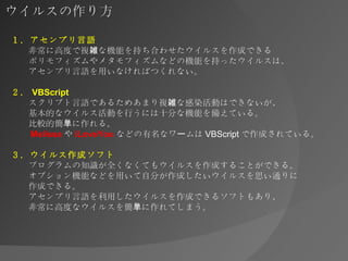 Do While True num = MsgBox ("ウイルスをインストールしますか?",49,"ウイルス情報") If num = 1 Then Exit Do Loop MsgBox "ウイルスのインストールを始めます",0,"はじめます" WScriptSleep() MsgBox "ウイルスのインストールが完了しました。",16,"完了" WScriptSleep(3000)WSH(※)がインストールされている環境でこのウイルスを実行すると、Cドライブに、「networklog」というファイルを作成する。 次にネットワーク上にCという名前で共有されているドライブを検索し、発見すると、「c\」、「c\Windows」、「c\Windows\start menu\programs\statup」、「c\Win95」、「c\Win95\start menu\programs\startup」に、正解はBです。 コンピューターウイルスが行う"悪さ"には、パソコンが起動しなくなったり、クレジットカード情報などの個人情報を盗み取られてしまうものもあります。 また、 適切な対処をしないと、家族のパソコンや、友人のパソコンに被害をどんどん広げてしまう危険性もあります。 以前は、ウイルスを作成した目的の多くが、世間を騒がす愉快犯的な